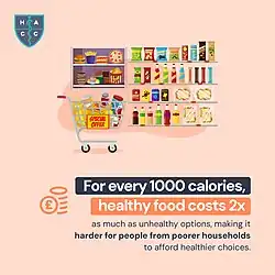 In the UK in 2020, about 70,000 deaths were linked to insufficient intake of nutritious, plant-based foods, while nearly 42,000 deaths were associated with the overconsumption of dairy, red meat, and processed meats (e.g., meats that have undergone processing to enhance flavour or shelf life). Reduced access to and affordability of nutritious foods may further drive dietary shifts toward cheaper, processed, calorie-dense options. This could exacerbate existing public health issues such as obesity and other diet-related non-communicable diseases, by making it harder for people to afford or access fresh produce.[13][68] Already, on average, healthy, nutritious foods cost £10 per 1,000 calories, while unhealthy foods that are more likely to cause obesity cost only £4.45 per 1,000 calories. This pattern is widening health inequalities, with individuals from low-income households in deprived socioeconomic areas being twice as likely to be obese and consuming 42% fewer fruits and vegetables than the recommended five daily portions.[13][68] In this way, 20% of households with children report experiencing food insecurity, rising to 45% of households in receipt of Universal Credit.[69]