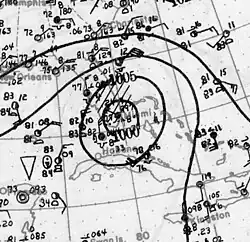 Forecasters such as Richard W. Gray, chief meteorologist at the Weather Bureau office in Miami, initially believed that the hurricane would not threaten Florida, predicting on September 12 that the storm would move westward and eventually dissipate over the Yucatán Channel.[17] However, the hurricane instead moved northwestward after striking Puerto Rico.[1] On September 14, a newspaper noted that there "seemed to be a tendency toward a curve eastward," meaning that a landfall in Florida was highly unlikely.[18] A. J. Mitchell of the Jacksonville Weather Bureau office and Gray then reaffirmed predictions that the storm would not threaten the state. Mariano Gutiérrez-Lanza of the Jesuit observatory in Belen, Cuba, agreed and noted that neither Cubans nor Floridians should be concerned about the hurricane. However, that same day, September 14, a weather report received by a wireless station in Jupiter indicated that Florida would experience the storm to some extent.[19]