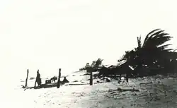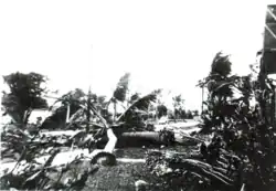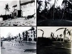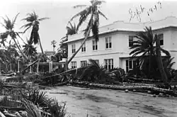In Delray Beach, which remained outside the eye,[27] stranded residents on the barrier island cut through downed vegetation to reach their homes.[28] At the Boca Raton Army Air Field, the destruction of barracks during the storm forced soldiers into safer administrative and radar-training buildings.[19] In all, on base the hurricane destroyed 150 barracks, supply houses, warehouses, the post stockade, the fire station, and the theater and mess buildings;[28] many of the destroyed structures were frail and temporary.[29] Losses as lately reported were 1947 US$4,500,000,[7] hastening existing plans to close the base by November 30, 1947.[30][31] At Hillsboro Beach homes suffered roof and window damage but survived;[14] at West Palm Beach, 40% of the initial 1947 US$1,500,000 in damages was related to roof damage.[26]