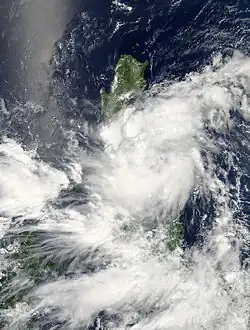 On January 11, Tropical Depression Bising developed east of the Philippines.[7][8][9] Bising caused moderate to heavy rains across Bicol Region, Eastern Visayas, Central Visayas and Mindanao.[10] More than 17,000 people were affected by heavy rains caused by Bising. About 229 passengers were stranded in Bicol. The NDRRMC had reported that no casualties were confirmed and damages were estimated at PhP 1.5 million (US$34,000) due to Bising.[11][12]