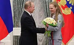 Vladimir Putin, the Russian President (on the left) congratulates Ekaterina Rumyantseva (on the right) after her medal success