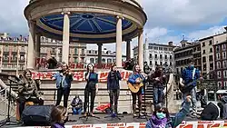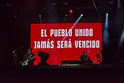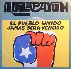 "¡El pueblo unido jamás será vencido!" (Latin American Spanish: [el ˈpweβlo wˈniðo xaˈma(s)seˈɾa βenˈsiðo]; English: "The people united will never be defeated") is a Chilean protest song, whose music was composed by Sergio Ortega Alvarado and the text written in conjunction with the Quilapayún band.[1] Together with the song "Venceremos", also by Ortega, it is one of the most successful songs of the Nueva canción chilena (New Chilean Song) movement.[2] The theme has a marching rhythm, highlighting its chorus, which is a shout or slogan with only percussion.[2] The song has been used in various protests around the world, most of which have no direct connection to the Chilean coup or Latin America. The lyrics have been adapted or translated into many languages.