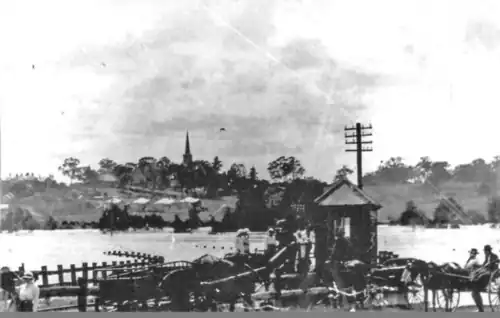 Elderslie station in the foreground, surrounded by floodwaters in the early 1900s