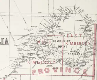 Based in the eastern part of the Kimberley region, the district was one of the original 30 seats contested at the 1890 election. In 1898, its major settlements were Wyndham and Halls Creek; it included the Kimberley Goldfield which had seen a gold rush a few years earlier.[1] It ceased to exist at the 1904 election, at which point it was amalgamated with the district of West Kimberley to form the new district of Kimberley.