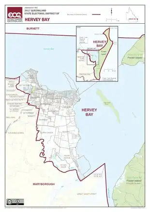 Hervey Bay is an electoral district of the Legislative Assembly in the Australian state of Queensland. It contains the majority of its namesake city, Hervey Bay, and also includes K'gari, formerly known as Fraser Island.[1]