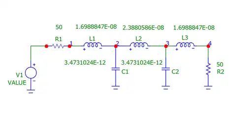 A fifth order, 50 ohm, Chebyshev filter with 1dB of pass band ripple and cutoff frequency of 1GHz designed using the Chebyshev Cauar topology and subsequent impedance and frequency scaling produces the elements shown in the table and Micro-cap schematic below.