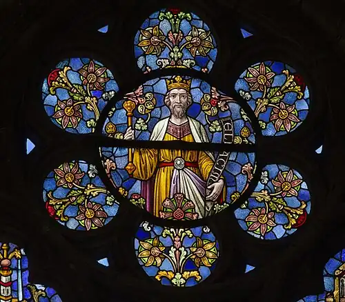 Elikim in stained glass window: The Tree of Jesse, 1934 (detail), by Gustave Ladon. North transept, Church of Our Lady of Pamele, Oudenaarde, East Flanders, Belgium