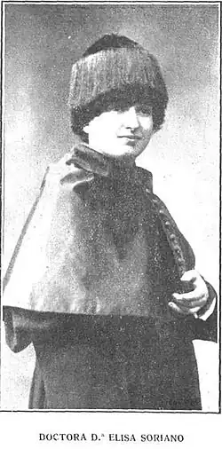 In 1914, shortly after women's access to the University was approved, Elisa enrolled in Medicine, being one of the first Spanish women to enter the higher education. Studying medicine and teaching at that time was a common practice among women of the time, because thanks to it they could secure a job in a much more favorable environment than that of doctors. In spite of being the only woman of the promotion of that year, she counted on the support of Sebastián Recasens, dean of Medicine and gynecologist. She chose ophthalmology as a specialty, which was also the specialty of Dr. Trinidad Arroyo, one of the three women who practiced medicine in the capital of Spain. In 1915, she worked as an auxiliary of the medical-school inspection of Madrid; a year later she was the first woman to request an assistant student to the Beneficiencia Provincial (Provincial Beneficence) of Madrid. She was also Deputy Secretary of Protección Escolar (School Protection). She obtained a degree in Medicine from the Complutense University of Madrid in 1918 and a PhD in 1919 with a thesis on ocular tumors.[6][5]