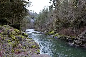 Elkhorn Creek is a 7.6-mile (12 km) long[3] stream in Marion County, Oregon, United States. Its source is on the northern edge of the Willamette National Forest, about 3.5 miles (5.6 km) north of Big Cliff Reservoir. The creek flows mostly west, receiving Big Twelve Creek, Buckhorn Creek, and Buck Creek all from the south, and it enters the Little North Santiam River just south of Elkhorn Woods Park, about 5 miles (8.0 km) north of the city of Gates.[1][2][5] The stream's valley is surrounded by the western Cascade foothills, covered with coniferous trees characteristic of the Pacific Northwest, and lined with red alders at the water's edge. The creek supports runs of rainbow and coastal cutthroat trout, as well as Pacific giant salamanders. On September 30, 1996, a 6.4-mile (10.3 km) portion of the stream, from the mouth nearly to the source, was protected as part of the National Wild and Scenic Rivers System.[6]