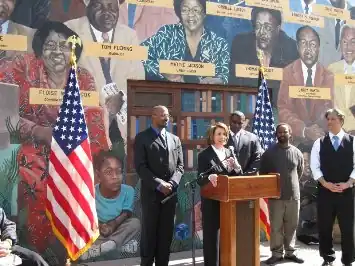 Congresswoman Nancy Pelosi standing in front of the Ella Hill Hutch Community Center.