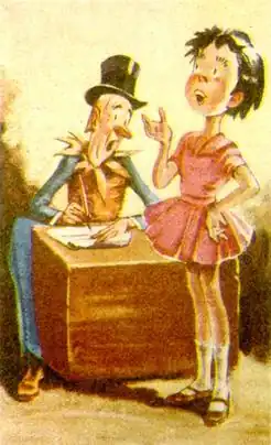 Emília with the Visconde de Sabugosa. An illustration of J. U. Campos for Memórias de Emília.