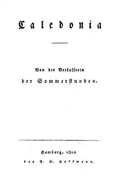 She left Switzerland in protest at the French invasion of the country and swore never to set foot in it again while it was occupied. She went to visit Scotland in 1799 and 1800. She had already met the polyglot Reverend James Macdonald in Germany who was acquainted with C. M. Wieland and J. G. Herder. Macdonald was an enthusiast for improving relations between Scotland and Germany. The vicar in Fife became Berlepsch's chosen host. He looked after her and took her on tours of Scotland; some of her time was spent in Edinburgh and some in the Highlands. Berlepsch wrote a four volume account titled Caledonia, in German, which described Scotland, including the remote highlands,[4] and discussed women writers publishing in English.[3]