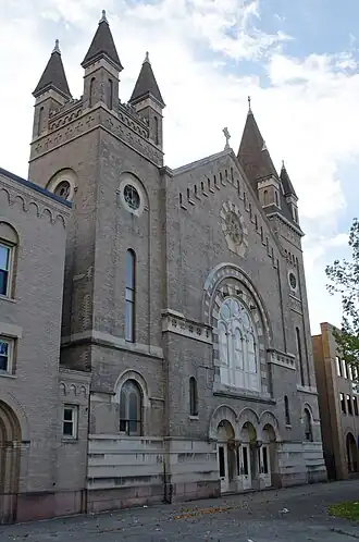 Lutheran Church of the Reformation, also known as Glory House International, is a historic church complex located at Rochester in Monroe County, New York. It was built in 1900–1902, and is a Late Romanesque Revival style sandy grey brick church with stone embellishments. It features two flanking towers of differing sizes on the main facade, round arched windows, corbel tables and stone window tracery. The larger tower has a steeply pitched pyramidal roof. Attached to the church by a hyphen is a three-story, less elaborate brick dependency.[2]: 14 [3]