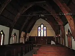 The Episcopal Church of the Transfiguration is a small wooden building with an essentially rectangular footprint. It has a steeply pitched gable roof and buttresses following this same angle. The church has triple lancet windows at the gable ends and pointed windows on the longer sides. There is board and batten around the lower parts of the walls and at the peaks of the gables. Between is clapboard siding.[3]