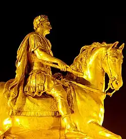 The sculpture is in gilded lead and depicts William in the style of a Roman senator. It stands on a stone plinth.[1] The front of the plinth carries an inscription. The statue is a Grade I listed structure, the highest grading given to buildings and structures of "exceptional interest".[1] David Neave, in his Yorkshire: York and the East Riding volume in the Pevsner Buildings of England series, revised and reissued in 2005, describes it as a "fine gilded equestrian statue".[7]