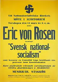 Poster from the National Socialist Bloc, announcing a 1935 meeting with von Rosen as its main speaker.