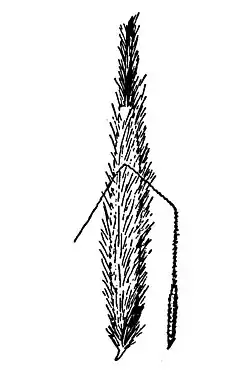 The inflorescence is up to about 30 centimeters long. Each hairy spikelet is just over a centimeter long and sharply pointed, with an awn about 4 centimeters long and kinked twice.