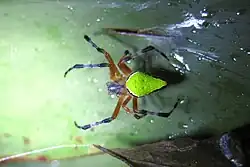 Eriophora nephiloides is distinguished by a diamond-shaped abdomen with the rear subtriangle being elongated and pointed and the fore subtriangle being shorter and rounded. Its abdominal dorsum ranges in color from a reddish-brown to a distinctive bright green or yellow, and may have white spots scattered across/throughout or stripes around the edge. Its underside has a jet-black square or rectangle, which is bounded in either white or yellow. The cephalothorax and upper legs are dark yellow-brown, and the lower segments of the legs feature black and white banding.[2]
