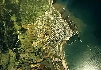 Aerial view of Esashi in the distance with Ōmu in the foreground | |