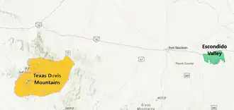 Escondido Valley is an American Viticultural Area (AVA) located in Pecos County of the Trans-Pecos region in western Texas. The area was established as the nation's 141st and Texas’ fifth AVA on May 19, 1992 by the Bureau of Alcohol, Tobacco and Firearms (ATF), Treasury after reviewing the petition submitted by from Mr. Leonard Garcia of Cordier Estates, Inc., proposing a viticultural area in Pecos County to be named "Escondido Valley." [5][7] The diminutive viticultural area encompasses approximately 32,000 acres (50 sq mi) and contained one commercial winery operated by the petitioner cultivating about 250 acres (100 ha) under vine.[1][8]
