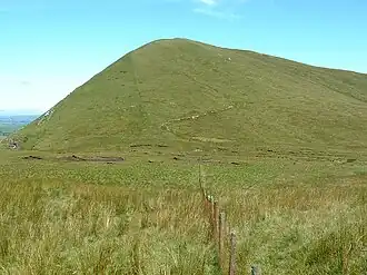 The peak is situated to the east of Aran Fawddwy, separated by Bwlch Sirddyn, and stretches right the way round Cwn Cynllwyd towards the Berwyn range at Foel y Geifr. The tops are all boggy in character, all rising from a wild, peat bog plateau. A road penetrates the plateau at Bwlch y Groes.[1]