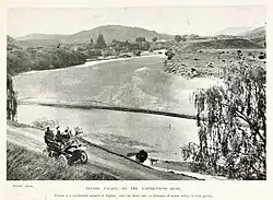 The river has had four names. Ahuriri Hapū refer to Esk River as Te Hukawai-o-Hinganga, as it was fast flowing, creating a froth (hukawai). An abbreviation of that name was Waiohinganga,[10] which is the name shown on early maps,[11] being the northern boundary of the Ahuriri Block in 1851.[12] By 1862 the name 'Esk' was described as a, "modern designation, which has, notwithstanding, generally failed to become acclimatized".[13] In 1865 it was referred to as 'Waiohinganga or Petane River'.[14] An 1871 description said the Napier-Tāupō road followed the Petane River bed for several miles.[15] In the 1890s one caption used 'Petane or Esk River'.[16] The Geographic Board notes that it, "is the only surviving English river name in Hawke’s Bay, all the others having reverted to their Māori names. There are several places of the same name, all probably originating from the Scottish Esk."[17]