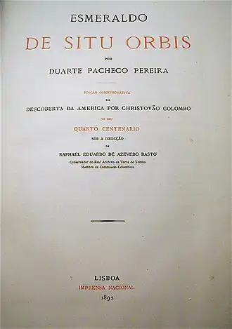 Esmeraldo de situ orbis was composed between 1505 and 1508, but remained unpublished until the 19th century.[10] Several editions have been published, in Portuguese, French, and English.[11] They are based on two 18th-century manuscripts: one at the Biblioteca Nacional de Portugal and another at the Public Library of Évora.[11] The original manuscript has never been found.[11]