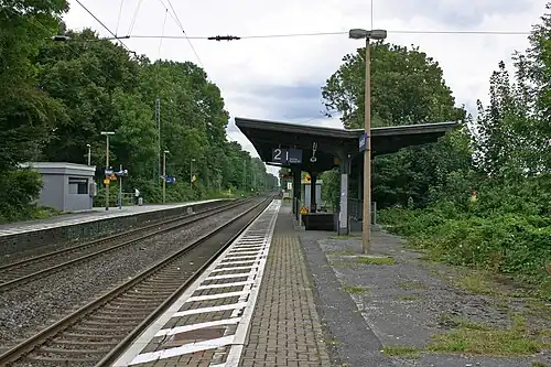 The station was opened in 1896 with the name Kray Süd as the second Kray station after the aforementioned Essen-Kray Nord from 1873. It contributed to the development of Kray and the neighbouring Leithe during the period of industrialisation in the Ruhrgebiet.[4][5] In 1929 Kray was incorporated into the city of Essen. In 1950 the station received its present name Essen-Kray Süd. In 1974 the station was classified as a Haltepunkt.[6]