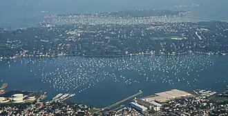 Aerial view of Salem Willows in Salem, Massachusetts. Also pictured are Marblehead, Massachusetts and its harbor.