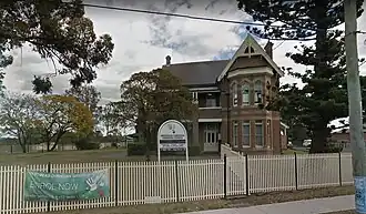 The house's original block - a late Victorian/Federation building with "Italianate" and "Gothic" elements - was L-shaped with gabled roofs finished with timber bargeboards and turned finials. Walls are polychrome brick and the building has a slate roof. A projecting bay window on the front (east) elevation features 2x2 pane double hung sash windows with sandstone sills and heads; first floor windows on the bay feature "four-centred" arch heads.[2]