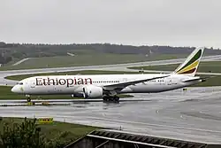 An Ethiopian Airlines Boeing 787 Dreamliner at Frankfurt Airport. The airline took delivery of the first aircraft of the type in August 2012 (2012-08).[19]