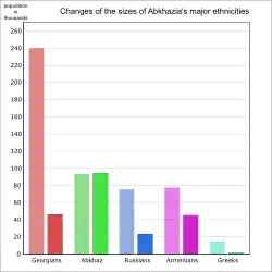 The exact number of those killed during the ethnic cleansing is disputed. According to Georgian data, 5,000 civilians were killed and 400 were missing.[28] Roughly 200,000 to 250,000 ethnic Georgians were expelled from their homes.[3] The campaign of ethnic cleansing also affected Russians, Armenians, Greeks, some Abkhaz, and other minor ethnic groups living in Abkhazia. More than 20,000 houses owned by ethnic Georgians were destroyed. Hundreds of schools, kindergartens, churches, hospitals, and historical monuments were pillaged and destroyed.[11][29]