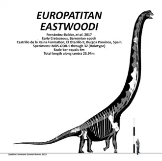 1. ^ a b c d e f g Fernández-Baldor, F.T.; Canudo, J.I.; Huerta, P.; Moreno-Azanza, M.; Montero, D. (2017). "Europatitan eastwoodi, a new sauropod from the lower Cretaceous of Iberia in the initial radiation of somphospondylans in Laurasia". PeerJ. 5: e3409. doi:10.7717/peerj.3409. PMC 5490465. PMID 28674644.