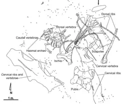 The type series, representing the only known individual of Europatitan, consists mostly of elements of the axial skeleton, with a few appendicular elements. Fernández-Baldor and colleagues listed the following elements as belonging to the holotype: five cervical vertebrae, one dorsal vertebra, nine caudal vertebrae, 11 cervical ribs, five dorsal ribs, seven chevrons, both scapulae, the left coracoid, two left metacarpals, both pubis bones, both iscia, and a single tooth.