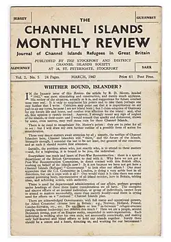 The Stockport and District Society was founded in January 1941, when 250 prospective members attended the first meeting. They decided to publish the Channel Island Monthly Review, despite a ban on new periodicals in August 1940 because of paper shortages. The first edition, a four-page sheet, appeared in May 1941. It quickly became popular by the thousands of Channel Island people living in the UK. The Review was threatened with closure in May 1942 after questions in Parliament.[29]