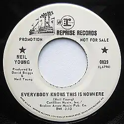 Young originally recorded "Everybody Knows This Is Nowhere" for his 1968 solo debut album Neil Young in a very different arrangement.[1] Rather than Crazy Horses' rock arrangement, the version recorded for Neil Young was backed by woodwind instruments.[2] Downing describes this version as sounding "pretty but passive" with "wistful vocal, beautifully layered guitars, strings and flute solo.[6] McDonogh describes the Neil Young version as "jaunty, restrained, polite, complete with a rooty-toot-toot Moog solo.[1] According to Downing, the rock version released on Everybody Knows This Is Nowhere loses none of the original versions's meaning.[6] A version of the song without Crazy Horse was released as a promotional single in March 1969.[2]
