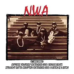 "Express Yourself" is a song recorded by American hip hop group N.W.A, performed solo by Dr. Dre. The song, off their 1989 album Straight Outta Compton, samples Charles Wright & the Watts 103rd Street Rhythm Band's song of the same name.[4] Unlike most songs on the album and by N.W.A, the song is devoid of profanity and violence. "Express Yourself" was released as the album's second and last single, the album version of the track features rap vocals from Dr. Dre only, whereas the extended single version features small verses from MC Ren and Ice Cube, the writer of the song. The song reached number 50 in the UK in September 1989, before reaching number 26 on reissue in June 1990.[5]
