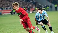 Coentrão (left) marking Ángel Di María in a friendly match against Argentina on 9 February 2011