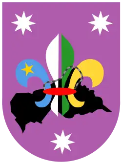 The Scout emblem incorporates the color scheme of the flag of the Central African Republic, superimposed on a map of the country.
