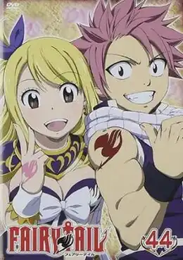 Cover of the forty-fourth and last DVD volume of the first series of Fairy Tail released by Pony Canyon in Japan on September 4, 2013, featuring Lucy Heartfilia and Natsu Dragneel.