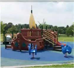 In 1999, Hadley's Park opened with a castle, a frontier village and a pirate ship. Rather than using gravel or woodchips, Hadley's Park had a rubber-based surface covering 34,000 square feet (3,200 m2) of playing surface.[5] This is one of the largest pour-in-place playing surfaces in the world.[5] The surface is durable enough for wheelchairs and walkers, yet soft enough not to hurt a child if they fall. The incorporation of high edge curbs, bright colors and braille signage supports visually-impaired children.[5]