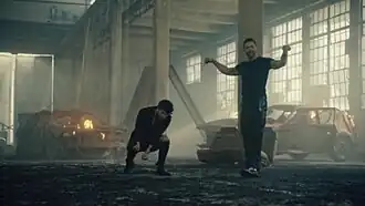 A screenshot from the music video, depicting Yatra and Martin singing the song in a ruined factory.