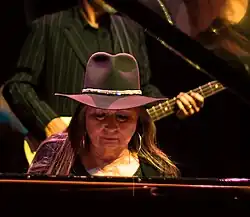He moved to Austin, Texas, where the burgeoning hippie music scene rejuvenated the singer. His popularity in Austin soared as he played his own brand of country music marked by country, folk and jazz influences.[13] In 1972, Nelson's friend Darrell Royal, introduced him to harmonicist Mickey Raphael during a jam session.[14] Nelson soon returned to the recording under a new contract with Atlantic Records.[15] His sister Bobbie, who performed on piano in Nelson's band during his childhood throughout the Texas Honky-Tonk circuit, joined the band during the recording of Shotgun Willie.[16] After Nelson's relationship with Jimmy Day became turbulent, due to his habitual drinking, and after he was shot by Paul English during a dispute, Day left shortly after recording Shotgun Willie.[17] Nelson retired the steel guitar from his backing, using Raphael's harmonica to replace the steel guitar on the melody lines.[18] He later also hired Merle Haggard's touring guitarist Jody Payne.[19] The final lineup consisted of Bobbie Nelson (piano), Paul English (drums), Bee Spears (bass), Mickey Raphael (harmonica), and Jody Payne (guitar).[20][21][22] The band that became known as the Family,[23] performed together for the first time at the Armadillo World Headquarters in Austin, Texas, where they were acclaimed by the audience.[24]