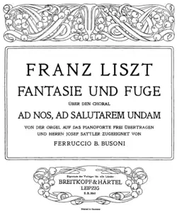 The Fantasy and Fugue on the chorale "Ad nos, ad salutarem undam", S.259, is a piece of organ music composed by Franz Liszt in the winter of 1850 when he was in Weimar.[1] The chorale on which the Fantasy and Fugue is based was from Act I of Giacomo Meyerbeer's opera Le prophète. The work is dedicated to Meyerbeer, and it was given its premiere on October 29, 1852. The revised version was premiered in the Merseburg Cathedral on September 26, 1855, with Alexander Winterberger performing. The whole work was published by Breitkopf & Härtel in 1852, and the fugue was additionally published as the 4th piece of Liszt's operatic fantasy "Illustrations du Prophète" (S.414).[1] A piano duet version by Liszt appeared during the same time (S.624).
