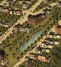 Inhabitants of the Northwest Parish were taxed to support both the meetinghouse and minister on Rochester Hill about 12 miles (19 km) away, a distance which made attendance difficult. A movement began in the 1770s to establish a separate township, and in 1783 a petition for charter was submitted to the state legislature. It was denied, but another petition in 1798 was granted. With about 1,000 inhabitants, Farmington was incorporated.[8] In 1800, a 40-by-50-foot (12 by 15 m), two-story meetinghouse was erected on Meetinghouse Hill. The same year, John Wingate established a blacksmithy. He would also become proprietor of Wingate's Tavern.