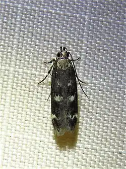 The forewings are shining dark purplish-brown or black with a large white spot on the disc just beyond the middle, and a white spot or streak which starts from the beginning of the costal cilia, but does not reach the dorsal margin.[4]