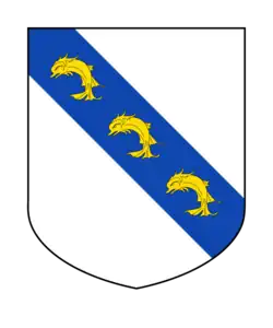 The Fawcett family bears the arms “argent on a bend azure three dolphins embowed” with the crest a “dolphin embowed”.[2][22][23] These arms were confirmed by the College of Arms in 1619. The three related branches of the Fawcett family bear these arms with different mottos: