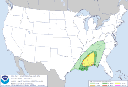 The warm side of the storm, in Alabama, had temperatures of nearly 70 °F (21 °C), an ingredient in forming powerful tornadoes.[56] On the morning of February 3, the Storm Prediction Center (SPC) issued a slight risk for tornadoes for portions of Mississippi and Alabama. The storm system spawned a supercell that produced three EF2 tornadoes in Western Alabama, the second of which struck areas near Sawyerville and caused significant high-end EF2 damage. One person was killed and eight others were injured, including three seriously. Two additional tornadoes, both rated EF0, impacted Elmore County as well, resulting in minimal damage.[57] The National Weather Service issued a particularly dangerous situation on the tornado warning for Sawyerville.[58] The tornado damaged 60 homes and destroyed 20 others.[59]