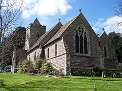 St Michael's Church dates to the 1853 to 1854 rebuilding to the designs of Hereford architect Thomas Nicholson (1823–95), one of his earliest works, with an 1891 added porch and recessed pyramid stump spire to the tower by Nicholson & Son. Constructed of "local grey sandstone" with a slate roof it comprises a nave with a stepped down and narrower chancel, a west tower, a north vestry, and a south porch. The church is of Decorated style, the tower of three stages with diagonal buttresses and a turret at the north-east. The upper bell stage has two-light louvered abat-son. Above the south entrance is a niche with a figure of St Michael. There are three windows in the chancel, the east being of three lights with geometrical tracery and stained glass imagery depicting Christ. The ceiling of the plastered-wall chancel is painted blue over the sanctuary at the east, with rafters having painted stars; at the north the vestry is entered through a "wide" arch. At the south of the chancel is a piscina and a window seat, and at the north, a "large" aumbry, with the floor laid with encaustic tiles. Fixtures and fittings included a Perpendicular font, and an 1882-dated pulpit with "symbols of the Evangelists". The stone reredos contains a statue niche and quatrefoil details.[25]