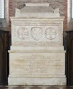 Ferreto also wrote poetry. His priapic verses survive only in fragments.[3] He wrote a poem in 110 lines on the death of Dante Alighieri in 1321, although it appears unfinished.[8] He may have met Dante at the court of Cangrande. He quotes from him and is one of the first who can be shown to have studied Dante's works. He also wrote six poems on the death of the Vicentine poet Campesani in 1323.[5] His major work in verse, however, is Carmen de Scaligerorum origine poema, a poem on the origins of the Scaligeri dedicated to Cangrande I.[9] It was written between Cangrande's takeover of Padua in September 1328 and his death in July 1329.[3] The original poem was in four books, but the surviving version has a fifth book in metrical prose that is not by Ferreto.[5]